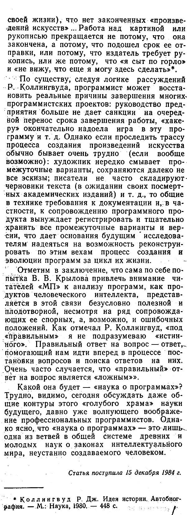 Отметим в заключение, что сама по себе попытка В. В. Крылова привлечь внимание читателей «МП» к анализу программ, как продуктов человеческого интеллекта, представляется в этой связи безусловно полезной и плодотворной, несмотря на ряд сопровождающих ее спорных, а, возможно, и ошибочных положений. Как отмечал Р. Коллингвуд, «под «правильным» я не подразумеваю «истинного». Правильный ответ на вопрос - ответ, помогающий нам идти вперед в процессе постановки вопросов и поиска ответов на них. Очень часто случается, что «правильный» ответ на вопрос является «ложным»».